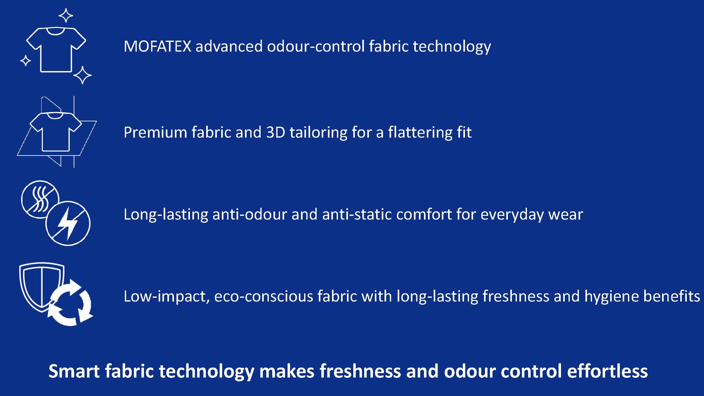 - MOFATEX™ IONLOCK anti‑odor tech: ion‑exchange sites on fibers attract and neutralize malodor molecules (e.g., ammonia, acetic acid, isovaleric acid, nonenal).