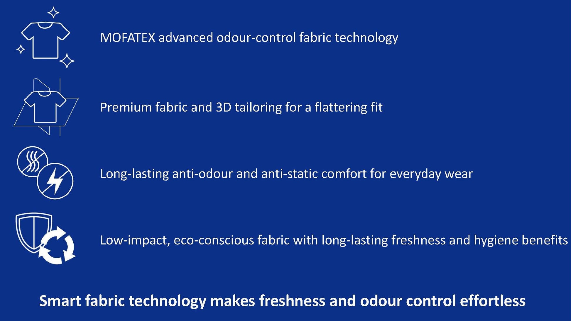 - MOFATEX™ IONLOCK anti‑odor tech: ion‑exchange sites on fibers attract and neutralize malodor molecules (e.g., ammonia, acetic acid, isovaleric acid, nonenal).